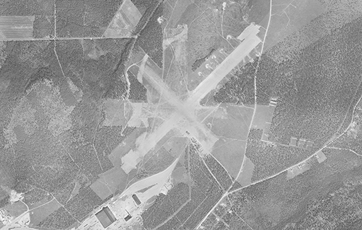 Hyvinkään lentokenttä 1949. Neljästä kiitoradasta kaksi on edelleen käytössä ja päällystetty. Kuva: Hyvinkään kaupunki