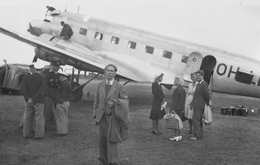 Matkustajia Hyvinkään lentokentällä. Taustalla Aero Oy:n DC-2 OH-LDA ”Voima”. Kuva: Voitto Kivi