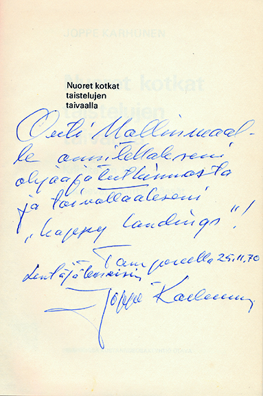 13-vuotiaana hankin kirjat Lentämisen taito ja Lentäjä ja sää, joista oli hyötyä sitten, kun aloin lentokurssin. Pian minulla oli parikymmentä pienoismallia (”lentofarmi”, tuumi perhe) ja ilmailukirjoja nelisenkymmentä. Ahkera lukeminen kannatti: kun Joppe Karhusen kirja Siipien sirkus ilmestyi, huomasin siinä asiavirheen. Isäni soitti Karhuselle, ja sain käydä hakemassa nimikirjoituksen Siipien sirkukseen. Unohtumaton kokemus! Myöhemmin, jo siipeni ansainneena, sain Karhusen nimikirjoituksen toiseenkin kirjaan.