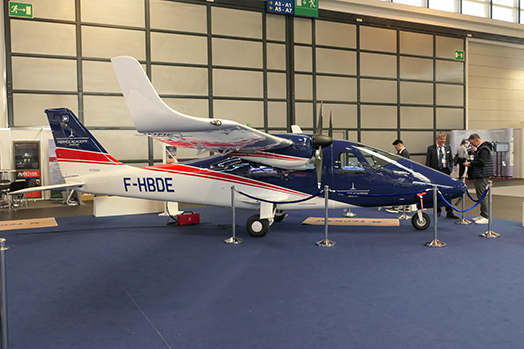 Tecnam oli tuonut paikalle valtavan, peräti kahdeksan koneen messuosaston. Tässä nelipaikkainen P2006.