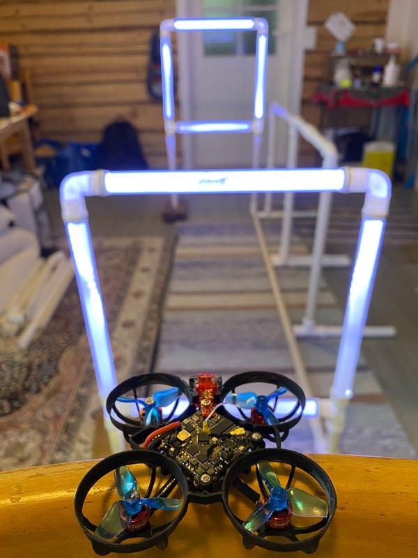 Jokinen esittelee myös mahdollisuuden lentoharjoitteluun pienemmässäkin asunnossa erityisillä kämmenen kokoisilla TinyWhoop-koptereilla. Niille voi rakentaa radan, jonka läpikäyntiä voi harjoitella lämpimässä, kun pakkanen paukkuu ulkona. Jokinen on itse nikkaroinut radan muovisesta asennusputkesta ja tuunannut sen itselleen sopivaksi.