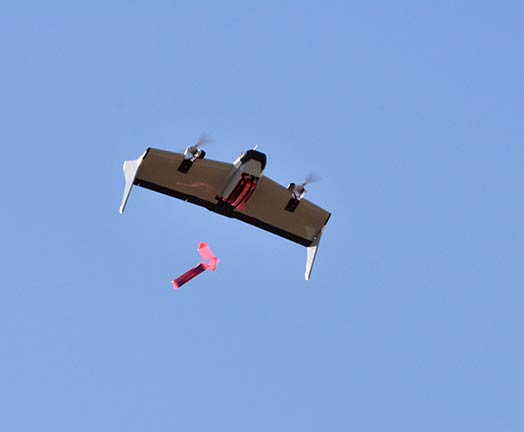 Testilennolla drone lentää sille ohjelmoitua lentorataa ja pudottaa muovipussiin käärityn lehden tarkasti sille määrättyyn paikkaan. Pussissa on pieni jarru, joka edesauttaa osumista.