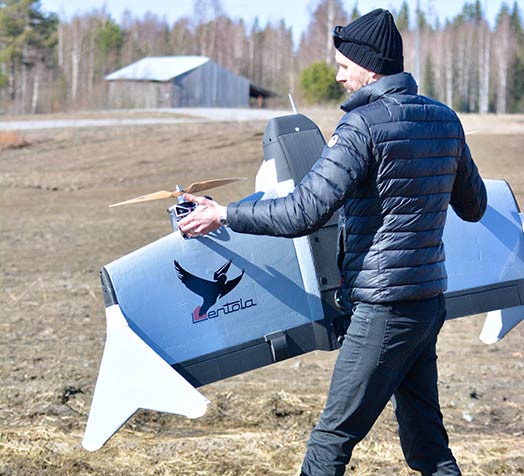 Lentola Logisticsin kiinteäsiipinen drone pyrähtää kuin raketti Tampereen naapurikunnan Pälkäneen pellolta taivaisiin. Vajaan sadan metrin korkeudessa se siirtyy potkurin suuntaa muuttamalla vaakalentoon. Mukana on kuusi sanomalehteä. Yrityksen alus on VTOL-kone (vertical take-off and landing), joka pystyy nousemaan ja laskeutumaan pystysuoraan. Aluksen tärkein ja patentoitu rakenneratkaisu mahdollistaa potkurivirran ja työntövoiman suunnan muuttamisen. Yhtiön nykyinen alus painaa noin 11 kiloa. Se voi kantaa päivittäisessä käytössä maksimissaan 3–3,5 kiloa rahtia.