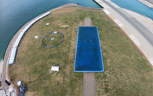 DIPC-kilpailu oli rakennettu Palm Dropzonen laskeutumisalueelle, minkä vuoksi dropzone oli muulta toiminnalta suljettu ja tandemitkin laskeutuivat pienen matkan päähän rannalle. Infra oli Dubaille tyypillisesti hulppea – joka maalle oli oma pieni teltta pöytineen ja tuoleineen taukopaikaksi ja mahtui siellä pakkaamaankin auringolta suojassa. Nurmelle oli aidattu tarkkuushypyn maalialue kilpailuinfroineen. CP pond ratoineen sijaitsee toki muutenkin alueella, ja henkilökunta vaihtoi ratoja lajien välillä muutamassa minuutissa. Tuomareille ja kilpailun organisaatiolle oli varattu omat ilmastoidut tilansa.