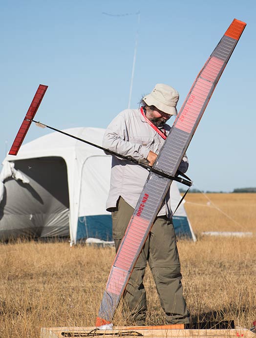 Tapio Linkosalo säätää lennokkiaan kisalentoa varten. Kuva: Anna Starova