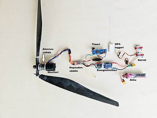 Taittolapainen potkurin on halkaisijaltaan noin 600 millimetriä. Harjattomassa moottorissa 5:1 alennusvaihde. Nopeudensäädin ohjaa moottorin käyntinopeutta. Energialimitteri mittaa käytettyä energiaa ja ilmoittaa, kun mitta on täysi. Timeri ohjaa lennokin lentoa ennalta ohjelmoidun sekvenssin mukaan, eli moottorin käynnistyksen ja sammutuksen, peräsinten säätämisen eri lentotiloihin ja lennon päättämisen. Servot kääntävät peräsimiä haluttuihin asentoihin. GPS-paikannin mittaa lennokin sijaintia ja lähettää tiedon lennättäjälle.