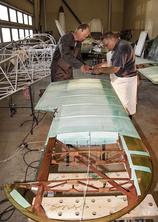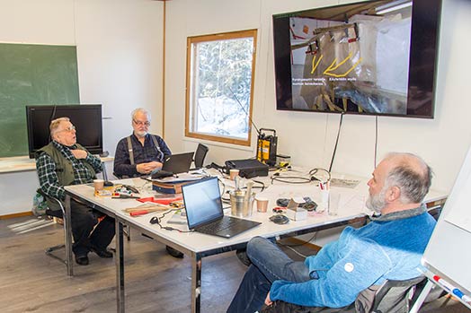 Aki Suokas ja Pentti Saaristo pitävät lentokoneiden puutyökurssia Nummelassa talvella 2023. Oikealla kurssille osallistunut Cumuluksen hinauspäällikkö Tom Arppe. Kuvat: Harri Mustonen