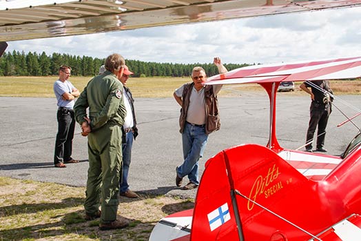 Legendaarinen taitolentokone Pitts Special, OH-XPA, jonka verhoilua uusittiin aikoinaan Saariston vetämillä kursseilla. Saaristo nojailemassa siipeen, vasemmalla selin koneen omistaja Raimo Nikkanen. Kuva: Harri Mustonen