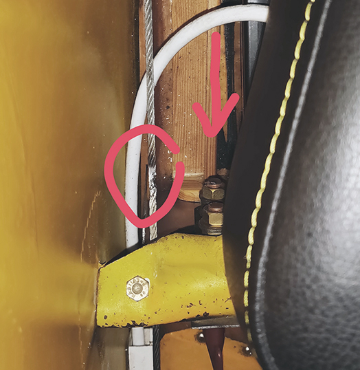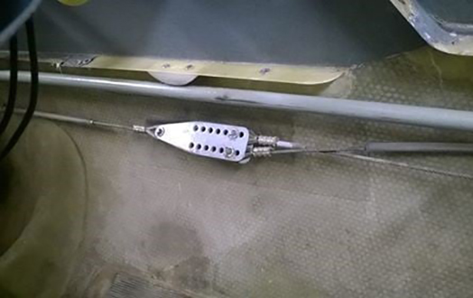 Sivuperäsinvaijerin haaroituspala on asennettu huolimattomasti. Vaijerit hankaavat toisiaan ja kumpikin vaijeri pitää vaihtaa ellei niitä korjata. Kone oli valmistumassa vuosihuollosta. Kuva: Matti Huoviala