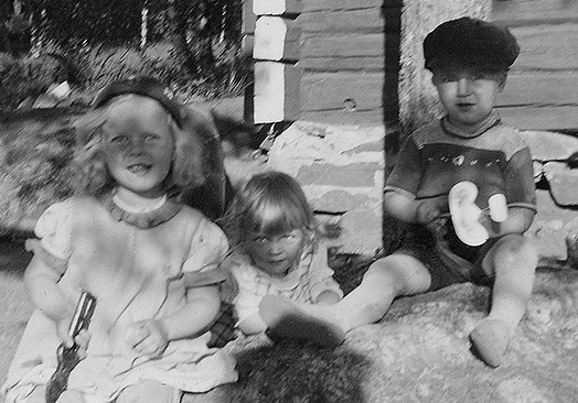 Lauri–poika 3-vuotiaana mökillä Laatokan saaressa kesällä 1939 lennokki kädessään ja serkkutyttöjä seuranaan. Kuva: Lauri Honkapirtin arkisto