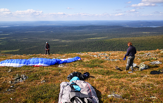 Samuel Riippa (vasemmalla) ja Juho Ruokanen valmistautuivat Lakukerolla lentoonlähtöön. Noin 762 metriä korkea Laukukero kuuluu Pallaksen tunturijonoon. Kuva: Jere Malinen