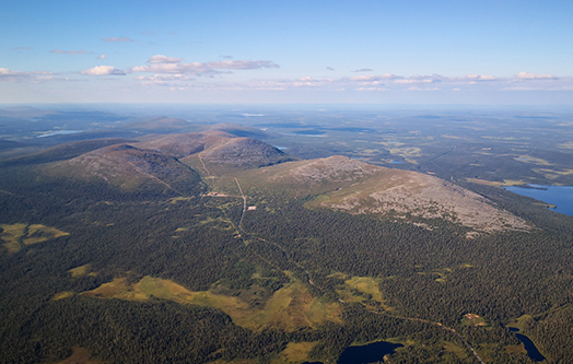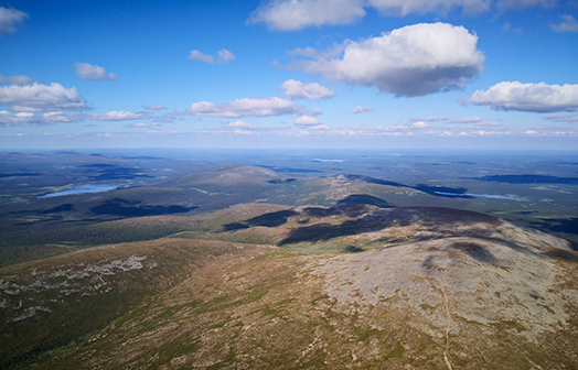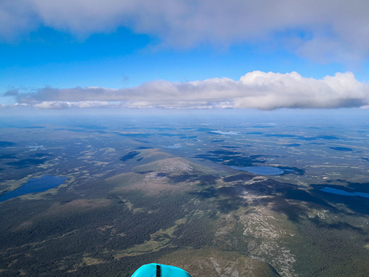 Lapin maisemat ihastuttavat varjoliitäjiä. Pohjoiseen katsottaessa lähimpänä oikealla kuvassa näkyy Taivaskeron tunturi.