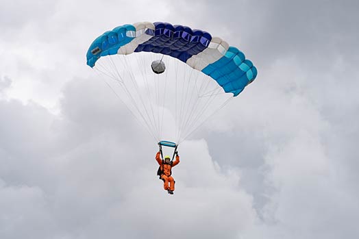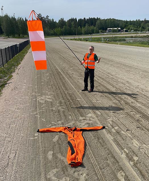 Maahenkilö varmistaa, että laskeutumisalueella on tuulen suuntaa ja voimakkuutta osoittava välineistö. Tämä koskee myös näytöshyppyjä raviradalle. Kuva: Valtteri Pihlström