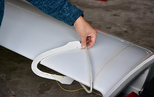 – Koneessahan ei ole oikein muuta ongelmaa kuin, että se ei kestä vettä eikä hyönteisiä. Sen lento-ominaisuudet heikkenevät heti, kun siipeen tulee jotain siihen kuulumatonta, Rissanen kertoo ja esittelee jälkeenpäin siipeen suunniteltua hyönteisten poistajaa, jota voidaan käyttää lennon aikana.