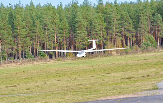 Kolmannen polven purjelentäjä ja 50-vuotisjuhlan organisoinut Riku Rissanen lähestyy Jämin kenttää PIK-20:llä 10.10.2023. Juhlaväki siirtyy lähemmäksi kiitotietä ja kamerat naksuvat. Laskun jälkeen seuraavat aplodit.