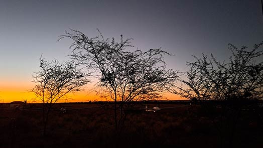 Namibiassa lennetään pitkiä lentoja viikoittain. 1000 kilometrin Online Contest -kilpailuun hyväksyttävä lento on varsin tavallinen suoritus, eikä FAI 1000 km+ ole harvinaisuus. Lentojen pituutta rajoittaa nopeasti laskeutuva pimeys, joka laskeutui lentoviikollamme Kiripotibiin 19.56 paikallista aikaa, auringon laskiessa 19.41. Auringon laskua edeltävät 40 minuuttia oli kiellettyä laskuaikaa kiitotielle 26 vasta-auringon aiheuttaman olemattoman näkyvyyden vuoksi. Lento oli syytä suunnitella siten, että ehtii laskeutumaan ennustetulla keskinopeudella joko ennen seitsemää tai viimeistään ennen 19.56. Tämän ajan jälkeen tuli ihan oikeasti pimeä.