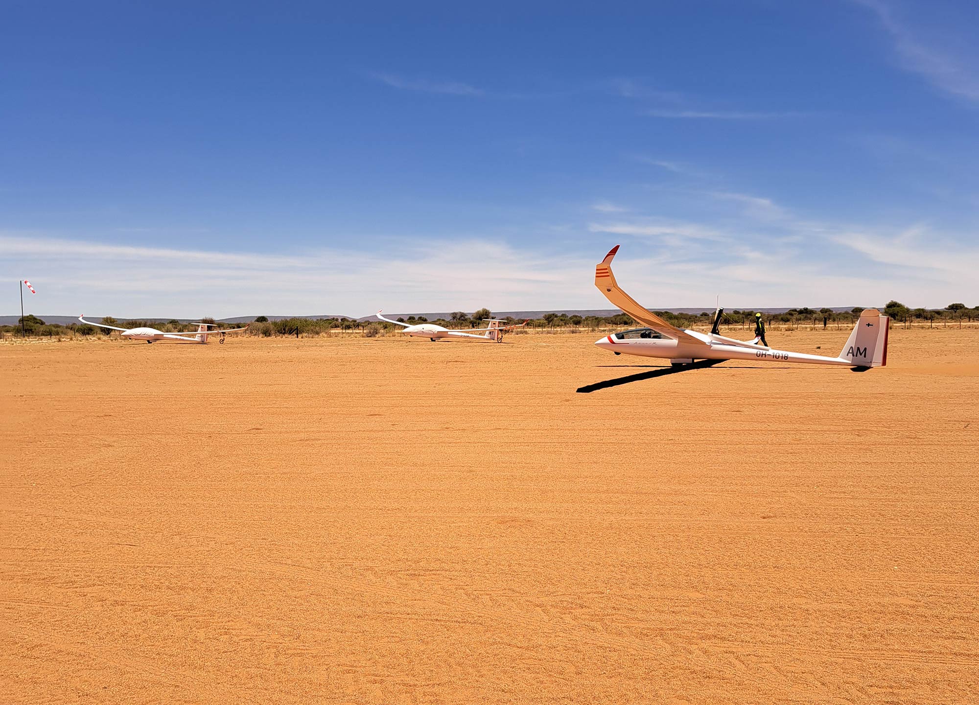 Aurinko nousee hitaasti aavikon yllä, ja kaukana horisontissa häämöttävät punahehkuiset dyynit luovat lähes epätodellisen näkymän. Keskellä karua mutta kaunista maisemaa, sijaitsee yksi maailman parhaista paikoista purjelennolle: Kalaharin autiomaa Namibiassa.