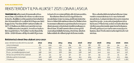 Kun katsoo ilmailualalla tapahtuneita muutoksia viime vuonna, päällimmäisinä tulevat eittämättä mieleen toisaalta Malmin lentoaseman sulkeminen ja toisaalta koronapandemia ja sen vaikutukset etenkin raskaan ilmailuun. Nämä huomioiden voinee pitää suorastaan ilahduttavana, ettei ilma-alusten lukumäärä ole vähentynyt vielä enemmän.