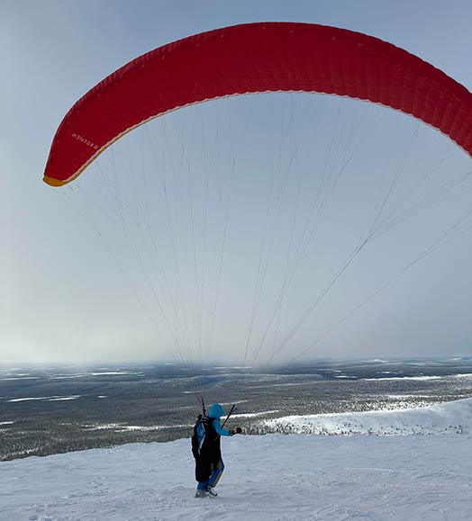 Pallas- ja Yllästunturi ovat rinnelentäjien suosiossa erityisesti Pääsiäisenä. Rinnestartit onnistuvat suht kovalta hangelta ja tuulet ovat sopivat. Kuva: Satu Löppönen