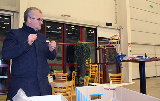 Petri Nygren lennättää talvisin myös sisällä. Kuvassa hän valmistelee kumimoottorilennokkia lennolle Turun Messukeskuksessa. Kuva: Timo Koskensalo