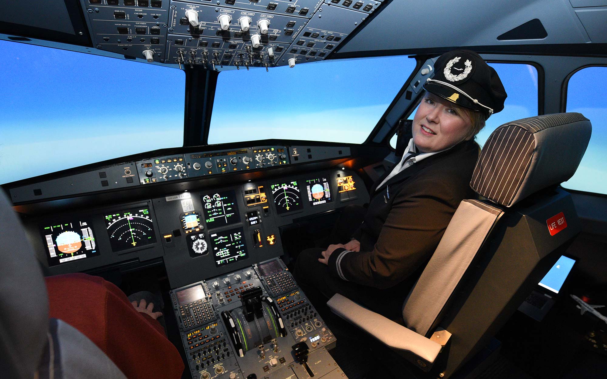 Arkistokuvassa Riika Kaipainen lennättää asiakkaita Takeoff Simulationsin Airbus-simulaattorissa Ilmailumuseossa Vantaalla. Hän on Suomen Ilmailumuoseon vapaaehtoinen siumlaattorilennättäjä.