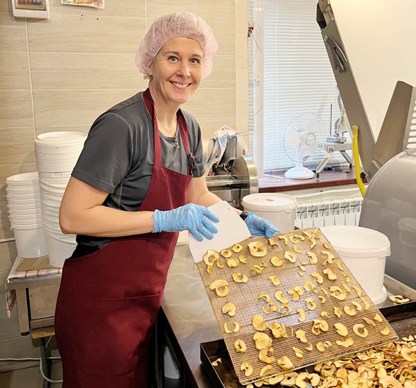 Yhdessä paikallisten vapaaehtoisten kanssa leivoin ja pakkasin tuhansia keksejä, täytin kuivausuuneja omenaviipaleilla, aprikooseilla ja kananjauhelihalla sekä raastoin porkkanoita ja herkkusieniä. Mittasin kuivattuja borssikeiton raaka-aineita tai aamupala-annoksia vaa’alla pieniin minigrip-pusseihin: 10 grammaa saksanpähkinöitä, 10 grammaa kuivattua omenaa, 50 grammaa kaurahiutaleita ja 5 grammaa rusinoita.